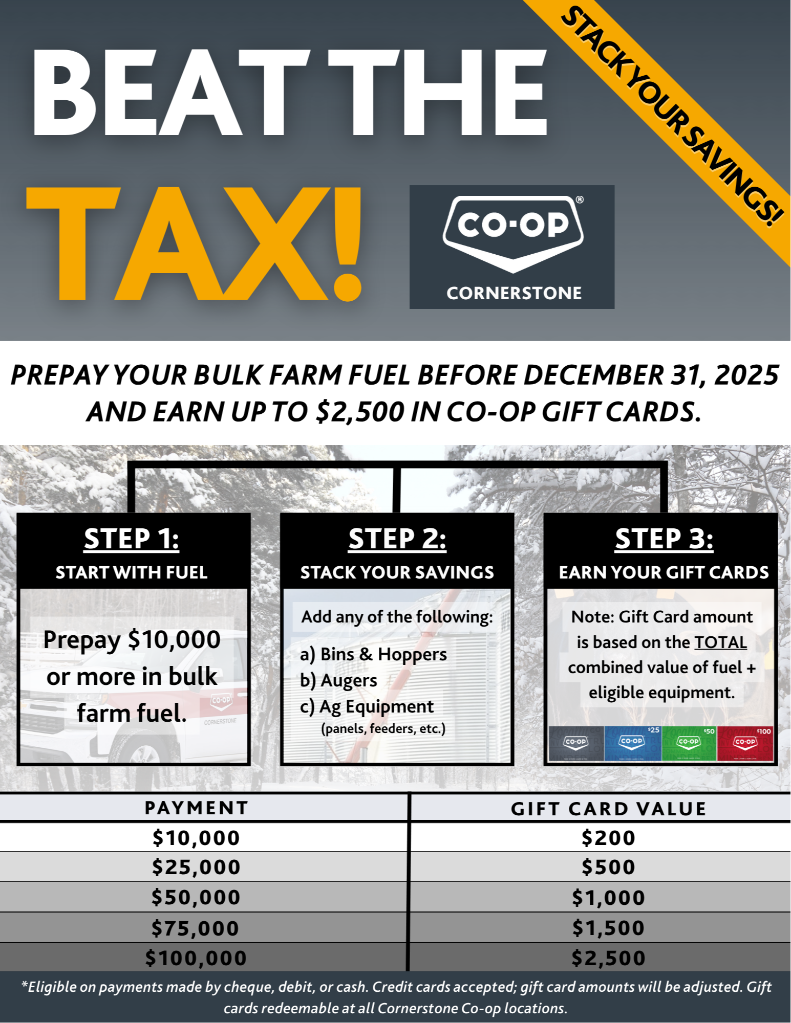 Farmers — it’s time to get ahead of year-end expenses and beat the tax with Cornerstone Co-op’s most rewarding fuel program. When you prepay your bulk farm fuel before December 31, 2025, you can earn up to $2,500 in Co-op Gift Cards.