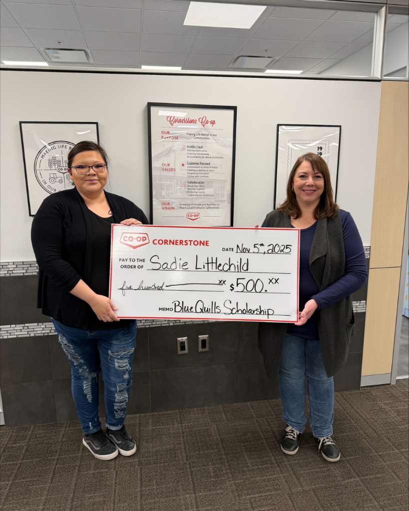 Cornerstone Co-op is proud to support Indigenous students pursuing post-secondary education through the Blue Quills Scholarship. This $500 scholarship is awarded to an Indigenous student transitioning into their first year of post-secondary studies at Blue Quills University.