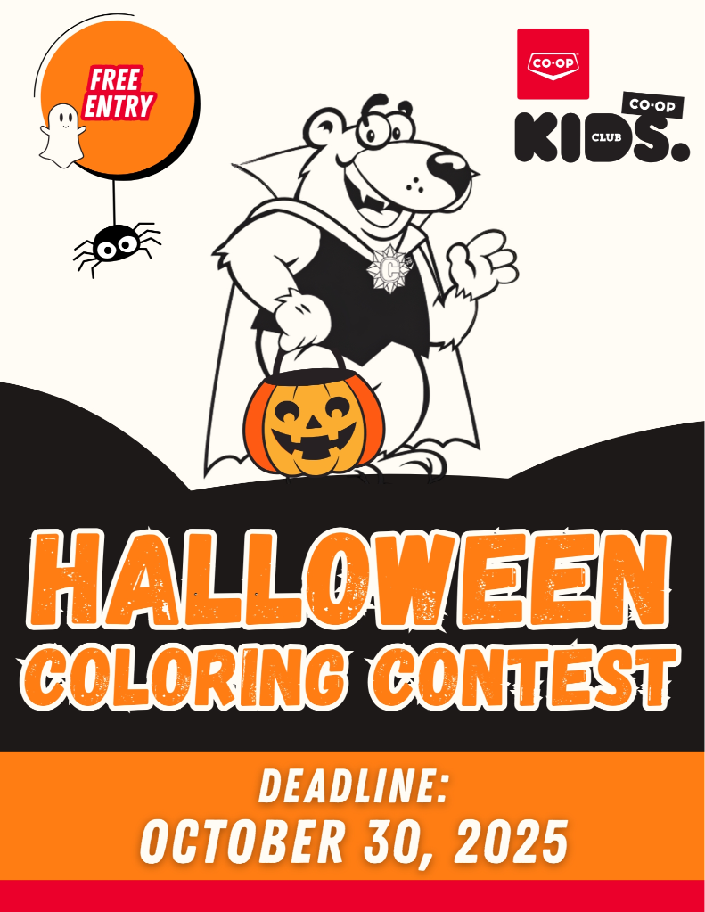 Pick up a Halloween coloring page at your local Cornerstone Co-op Food Store by visiting the Customer Service Desk OR print one from home using the link below.